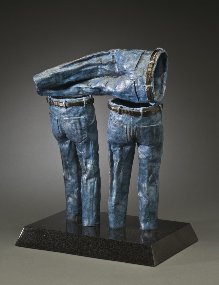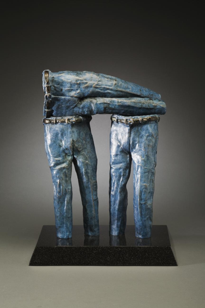 JeanHenge TM is a maquette of the larger installation I am raising funding for. This Henge stands 14" tall 12"wide and 9" deep,  weighing in at 20 lbs it is not a light weight.  JeanHenge has a durable blue patina and is almost certain to be a conversation piece.